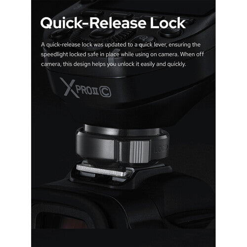 Designed for the 2.4 GHz Godox X wireless radio system, this XPro II TTL Wireless Flash Trigger lets you effectively and reliably trigger flashes up to 328' away. This upgraded model is compatible with the Canon TTL system, including support for high-speed sync up to 1/8000 second, and offers advanced control capabilities for working with system-specific features. For ensuring maximum reliability and control, users can set up 16 groups on one of 32 channels and can then access 99 wireless ID settings for limiting interference from other nearby systems.