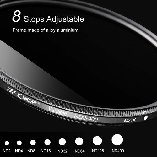 This Variable Fader ND2-ND400 Filter from K&F Concept is a 67mm variable neutral density filter providing an adjustable light reduction of 1 to 8.6 stops. It darkens the entire image evenly, allowing a photograph to be made with a wider aperture or slower shutter speed than normally required. By slowing the exposure time or increasing the aperture, it is possible to control the depth of field and blur movement easily, creating a dynamic look for streams, waterfalls, landscapes, and more.