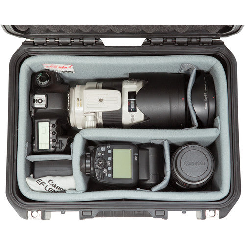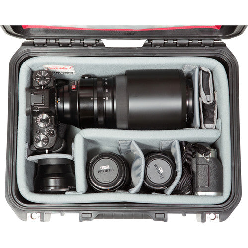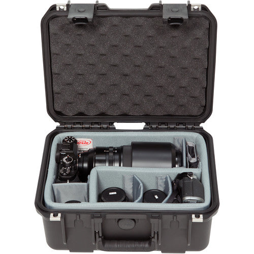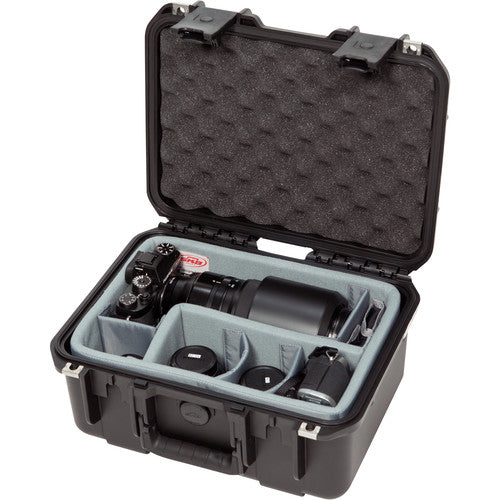 Store, transport, and protect two cameras, up to four lenses, and related accessories with the watertight, dustproof, molded SKB iSeries 1309-6 Case with Think Tank Photo Dividers & Lid Foam. The black case features two trigger latches, two metal-reinforced locking loops for optional padlocks, an automatic ambient pressure-equalization valve, and an over-sized top handle. For added protection, there's a thick layer of convoluted foam under the lid.