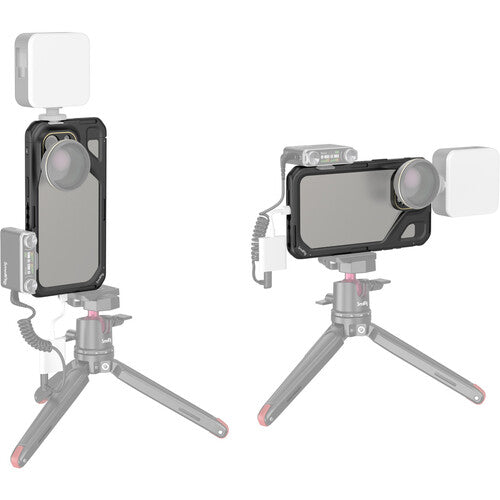 Designed for the iPhone 15 Pro Max, the Mobile Video Cage from SmallRig is well suited for professional videography, live streaming, vlogging, and more. Multiple 1/4"-20 threaded holes and cold shoe mounts support accessories, including a side handle, tripod, microphone, LED light, hand strap, and more. Its rear lens backplate is compatible with M-mount lenses but may be swapped out for one that supports Moment T-Series lenses, as well as 17 and 37mm threaded lenses. The cage's hollowed-out design allows full access to your phone's port and buttons. Users will also be able to take advantage of radar, ultra-wide-angle lenses, and MagSafe wireless charging. This cage features a quick-lock design that makes it more user-friendly to assemble and disassemble, while also making it safer and more stable. Thanks to metal construction and built-in pads, your phone will be protected from vibration and scratches, no matter if you're shooting horizontally or vertically.