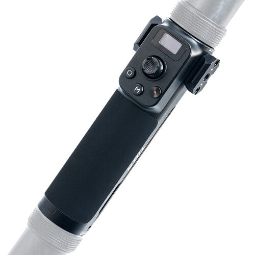 Wirelessly control your Ronin RS 2 or RS 3 Pro gimbal from a handle mounted on the Advanced Support Ring or Dual Handle Power Supply Bracket with the Tilta RS 2 Remote Control Handle. The kit features a wireless control handle that mounts on your Advanced Ring, allowing you to control the gimbal without taking your hand off the support ring. The handle lets you access your gimbal's settings, as well as the photo and video record functions.
