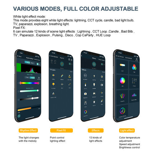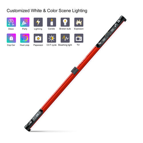 The 48" BD45R Bi-Color RGB LED Light Wand from GVM has a 45W beam and a 97 CRI rating for precision color rendering. It works as a serious light source or a fun, handheld accessory light for spontaneous effects. The light is capable of pinpoint color selection in color temperature, hue, and saturation, or RGB modes, while its 12 scene light effects and 6 Pixel FX modes allow for creative and vibrant combinations. The light is dimmable in three brightness presets by pushing the power button, or on a precision scale of 1 to 100% in the settings.