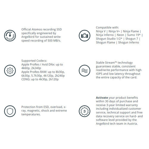 This 1TB Angelbird AtomX SSDmini is custom-designed to fit into a variety of Atomos products while maintaining high data throughput rates necessary for a 4K workflow. It fits perfectly into the Atomos Ninja V, Ninja Flame, Ninja Inferno, and Shogun Inferno. An optional adapter handle enables using this SSD with the Shogun Studio, Sumo 19, and Sumo 19M.