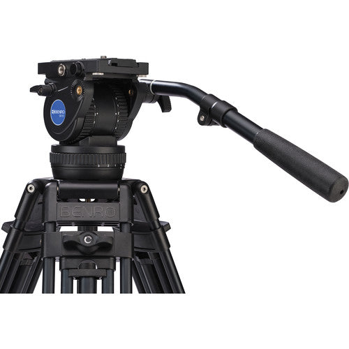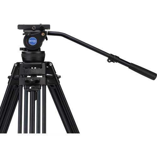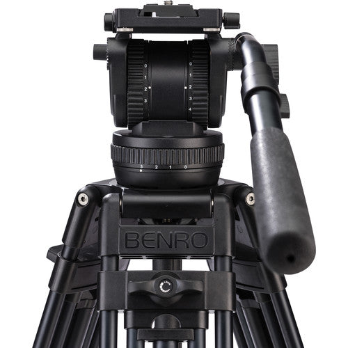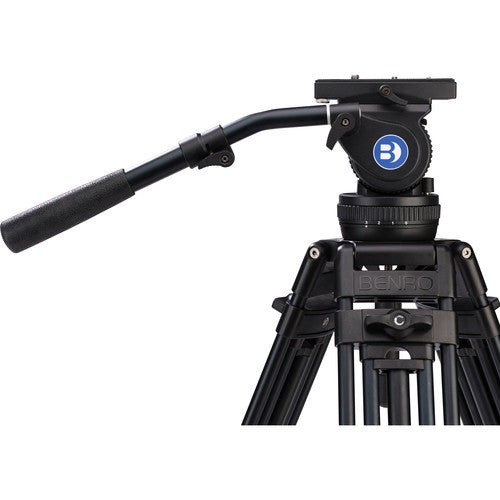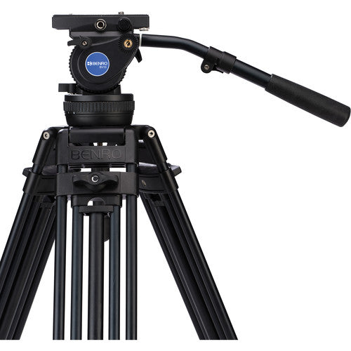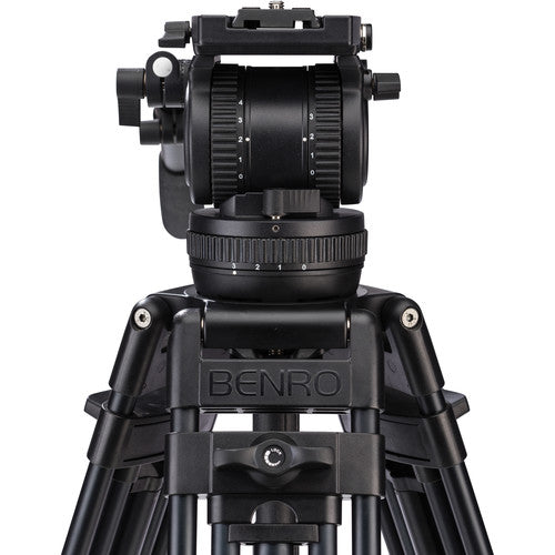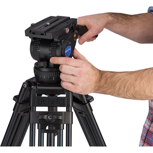 The Benro BV10 Twin-Leg Aluminum Tripod Kit is a complete tripod system ideal for studio applications and handling larger, fully rigged cameras weighing up to 22 lb. The kit pairs the 100mm-ball BV10 video head with a twin-leg aluminum tripod. The BV10 head features a 5-step counterbalance system to dial in the correct amount for your setup, and independent 4-step pan and tilt drag settings for precise control over camera movements. A Manfrotto 501/504PL compatible sliding quick release plate is provided. All the main controls aside from counterbalance are located on the left side of the head, making it easy to make adjustments with a single hand while operating the camera. For added versatility, the 100mm ball tie-down stud is removable to convert the head to a flat base for use on a slider or other support device.