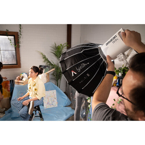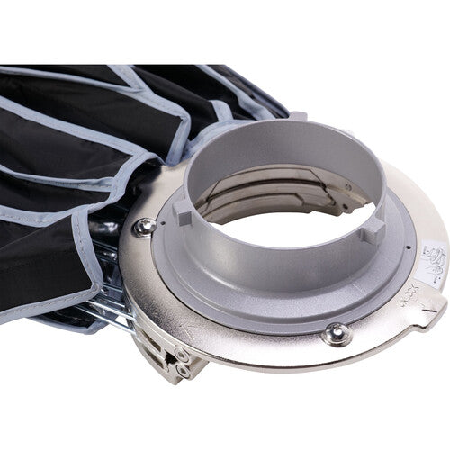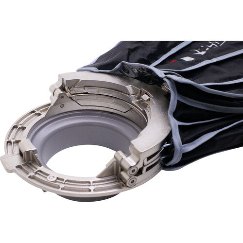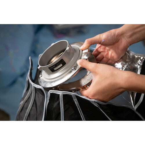 Armed with an upgraded dual-sided and foldable quick release mechanism, the 22.8" Light Dome Mini III from Aputure accelerates the set-up time for its 16-sided, point source-softening circular softbox, bringing professional, portrait-ready light to any shoot in mere seconds. Optimized for lightweight portability, the parabolic, hexadecanol structure of the Light Dome Mini III is fortified by 16 durable steel support rods, which now snap into place with the downward press of its widely-compatible Bowens Mount bracket, saving valuable time on set. Its shape also promotes uniform light output distribution for soft, even light on any subject. The modifier features a silver interior to maximize the light output and comes with a front diffusion cloth, a gold/silver inner baffle, and a 40° fabric grid for further light-shaping capabilities.