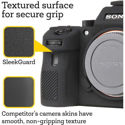 Keep a secure hold on your Sony a7 III Series and a7R III camera while protecting it from fingerprints, bumps, and other hazards with this Ruggard SleekGuard Silicone Camera Skin. Thoughtfully designed for your use and comfort, the skin is custom-fit for your camera body to retain access to all the features and functions including battery compartments, peripheral connection ports, dials, and buttons. Made of textured silicone, the skin is formfitting and easy to hold. For your convenience, it has OEM button labels to help you navigate through the menus and settings.