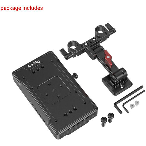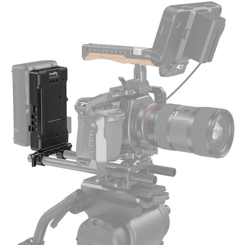 Power your camera and a variety of accessories from a single high-capacity V-mount battery with the V-Mount Battery Adapter Plate with 15mm LWS Rod Clamp & Adjustable Arm from SmallRig. The battery plate provides a V-mount for a single V-mount battery and one 14.8V D-Tap output, one 5V/2A USB output, one 8 VDC barrel output, and two 12 VDC barrel outputs around the sides of the plate.