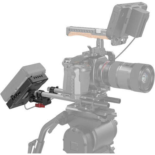 The aluminum plate features multiple 1/4"-20 threads on the back to mount it onto a variety of arms, cages, clamps, or rigs. The attached adjustable arm allows you to quickly adjust the position of the clamp, and the attached 15mm LWS rod clamp allows you to mount the assembly onto standard, separately available 15mm LWS rods using locking levers. The rod clamp also features multiple 1/4"-20 accessory mounting threads for additional mounting options. The plate features a power button on the side so you can quickly cut the power from the battery.