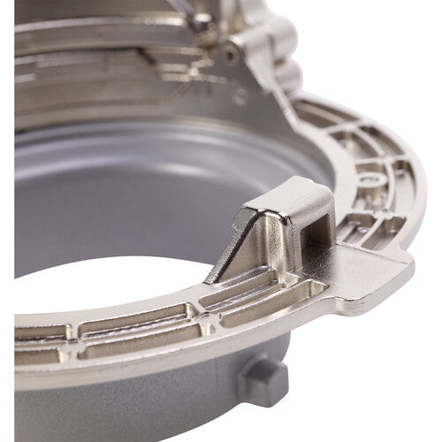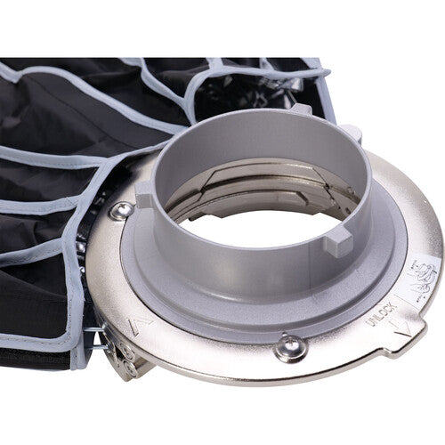 Armed with an upgraded dual-sided and foldable quick release mechanism, the Light Dome III from Aputure accelerates the set-up time for its 16-sided, point source-softening circular softbox, bringing professional, portrait-ready light to any shoot in mere seconds. The parabolic, hexadecanol structure of the Light Dome III is fortified by 16 durable steel support rods, which now snap into place with the downward press of its widely-compatible Bowens Mount bracket, saving valuable time on set. Its shape also promotes uniform light output distribution for soft, even light on any subject. The modifier features a silver interior to maximize the light source's output and comes with 1.5-stop and 2.5-stop front diffusers and a 40° fabric grid for further light-shaping capabilities.