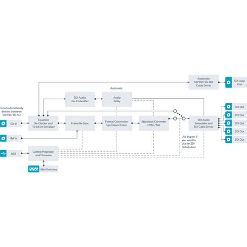 Using 4K HDMI and 6G-SDI technologies, the Mini Converter automatically detects the input video format and instantly changes between SD, HD, and UHD/DCI 4K formats. The two 6G-SDI outputs also support SD and HD-SDI signals for integration into existing workflows. Both 6G-SDI outputs send duplicate signals. Audio is embedded in the SDI output from either the HDMI input or from the two 1/4" input jacks which support four channels of AES/EBU digital audio or two channels of analog audio.