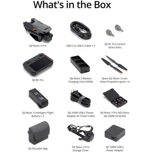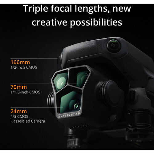Filmmakers get more control over what they capture with this Mavic 3 Pro Drone Fly More Combo with DJI RC Pro from DJI. This flagship drone adds a third lens to the system with the 70mm f/2.8 medium telephoto to enhance your creative possibilities with more control of how much you capture of a subject and their surroundings. Remaining are the impressive 24mm Hasselblad wide-angle lens, with 5.1K resolution, and the 166mm telephoto, which has been upgraded to f/3.4 and 60 fps for more light sensitivity and smoother video. This tri-camera system joins other Mavic 3 technologies, such as O3+ long-range transmission, up to 43 minutes of flight, and omnidirectional sensing with APAS 5.0 to make the Mavic 3 Pro safe, even for beginner pilots.