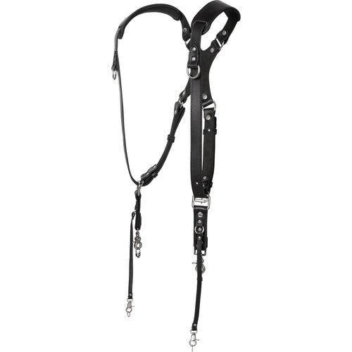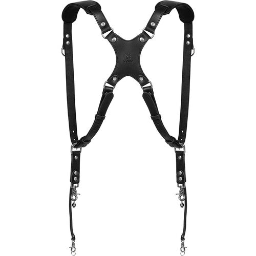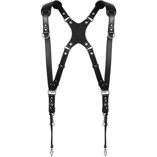 The black Skinny Dual Camera Harness has a one inch width, provides security and comfort, and enhances your creative impulse. Made from high-quality, genuine leather, it can support up to 45 pounds. The underside has a rough texture to keep it in place on your shoulders and the padding increases the comfort level of the harness.