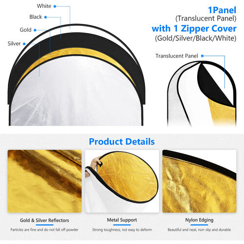 This 2 x 3' Neewer 5-in-1 Portable Lighting Reflector/Diffuser Kit is an ideal way to soften contrast and add warm or cool tones to your subject. The 5-in-1 is built around a sturdy but flexible diffusion frame that allows you to subdue harsh illumination such as sunlight. The gold/silver side of the reversible sleeve produces reflected light that warms the blueish light evident in open shade or allows you to create a late afternoon light quality. Conversely, the silver surface renders snappy light with a cool cast that's useful for long-throw work. The white side of the slipcover provides soft, neutral light while the black side provides "negative reflection" to strengthen shadows and contrast. The reflector includes a fabric carrying case.