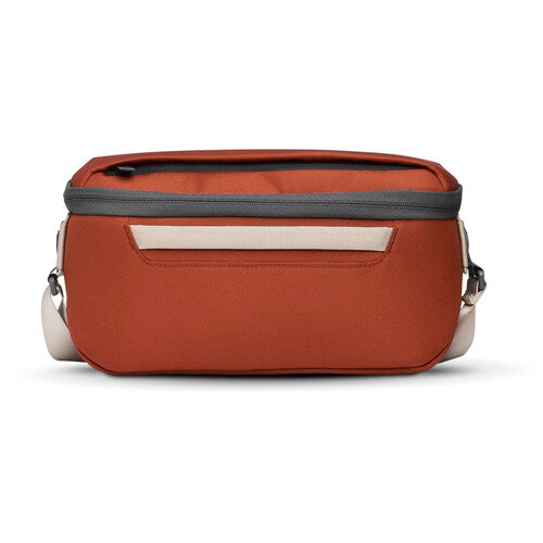 The rust, 9L LUMA Camera Sling from Nomatic is a collaboration between Nomatic and Peter McKinnon. Designed to be compact yet spacious, you can organize and customize the interior to fit your needs with the included hook-and-loop dividers. This sling accommodates a camera, drone, action cam, chargers, microphone, or hard drive. Durable 900D polyester oxford fabric and a sturdy metal frame keep gear protected and maintain the sling's shape. Comfortably carry the sling with the adjustable shoulder strap. The strap attaches to the sling with aluminum pivot rivet hardware so you can adjust it to a comfortable position. The soft Nylex interior fabric keeps the dividers in place and protects delicate equipment. There are two zippered mesh pockets for small accessories and the exterior pocket is useful for storing quick access items like your phone or wallet.