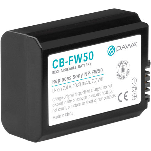 The Pawa NP-FW50 Lithium-Ion Battery Pack works with the same cameras as the Sony NP-FW50. This rechargeable replacement pack features 7.4V of output power, a capacity of 1030mAh, and a rating of 7.7Wh. Small and lightweight, lithium-ion batteries can be charged or discharged at any time without developing memory effects.