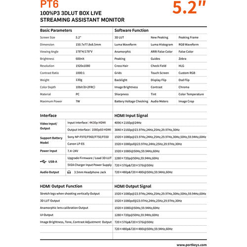 Add nuanced, LUT-enhanced imagery to your video monitoring using the PT6 5.2" 4K HDMI Touchscreen Monitor from PORTKEYS. This compact, 5.2" touchscreen monitor supports the DCI-P3 wide color gamut and offers a host of imaging tools like focus peaking, image cropping, and anamorphic output. It features up to 4K30 HDMI input and 1080p60 output, UI output, and a stretch function for vertical monitoring.