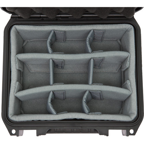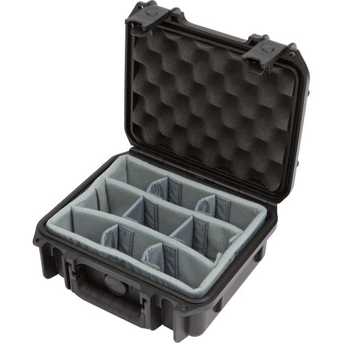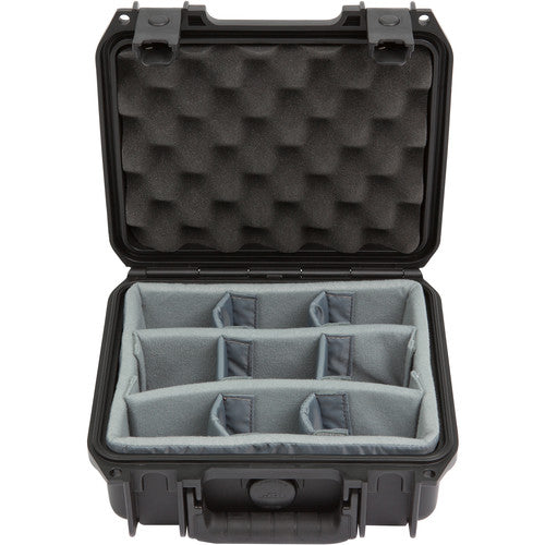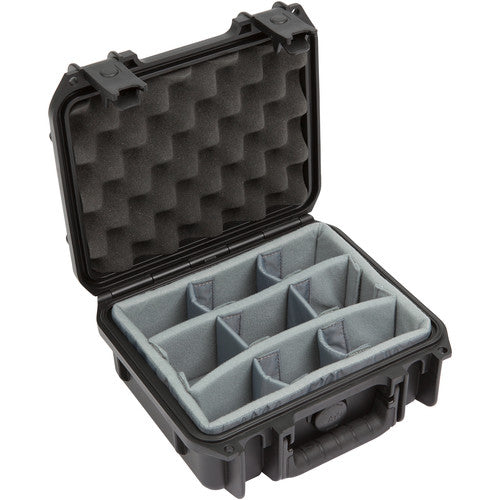 The black SKB 3I-0907-6-L Small Mil-Std Waterproof Case 4" Deep with Think Tank Designed Dividers is an injection-molded, ultra-high-strength, polypropylene-copolymer resin case. It features a gasketed, dust and waterproof, submersible design that is resistant to UV, solvents, corrosion, fungus, and impact damage. The case is ATA category-1 rated. There is a continuous molded-in hinge, a trigger release latch system, a comfortable, snap-down rubber overmolded cushion-grip handle, and an automatic ambient pressure equalization valve. The case is lockable with a customer-supplied padlock.