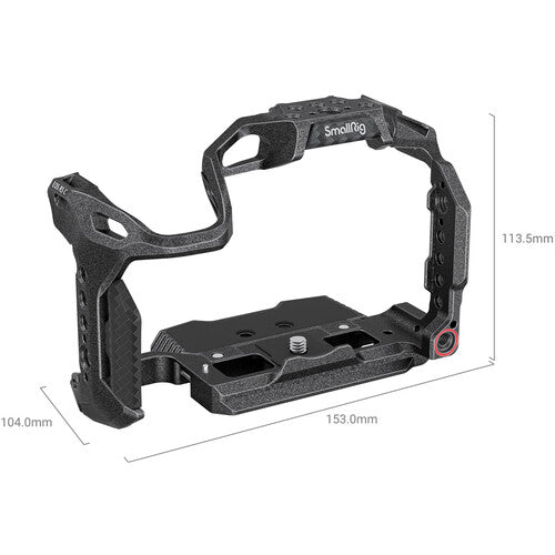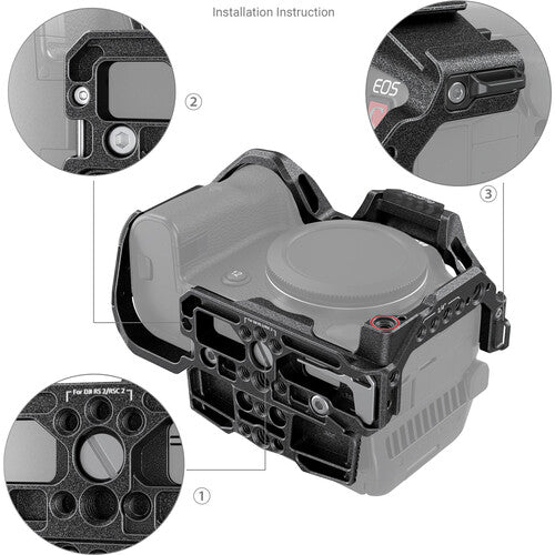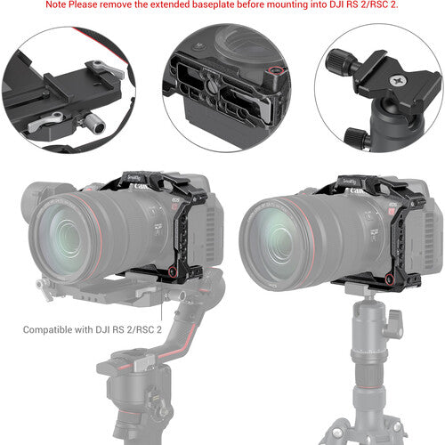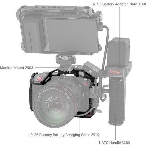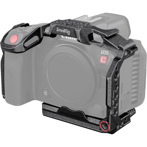 Provide accessory mounting and protection for your Canon EOS R5 C camera with the lightweight aluminum "Black Mamba" Camera Cage from SmallRig. This formfitting cage features a sleek, rough-black finish with carbon fiber-style details, maintains access to the camera's controls, battery, and SD card slot, and features a variety of mounting options.