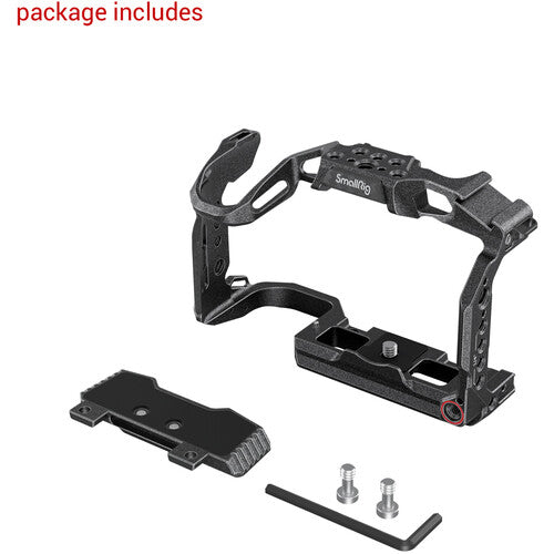 The cage features an integrated Arca-type mount on the base, so you can mount it onto standard Arca-type heads and bases. It also features a detachable baseplate that can improve the balance of the camera, as well as rise it up for added clearance when mounting the camera on a rig or dovetail plate. There is a shoe mount on top and a NATO rail on the side, and integrated strap slots allow you to add a separately available wrist strap. A screwdriver for securing the camera screws is included.