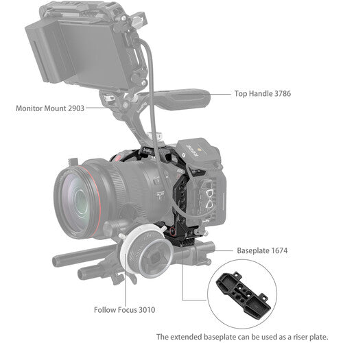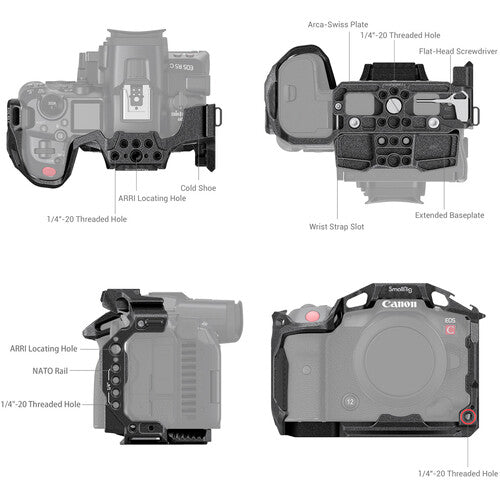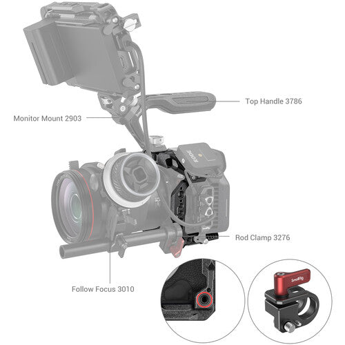 The camera mounts onto the cage using a 1/4"-20 screw and an M4 screw to prevent the camera from twisting. In addition to multiple 1/4"-20 and 3/8"-16 accessory threads, the cage features ARRI-style locating holes to prevent accessories, such as an optional top handle or HDMI cable clamp, from twisting when mounted on the cage.