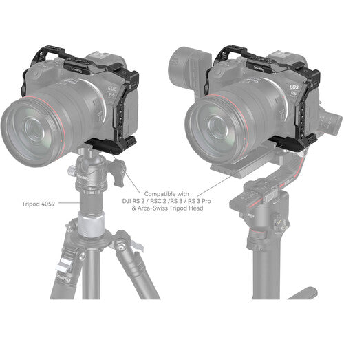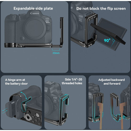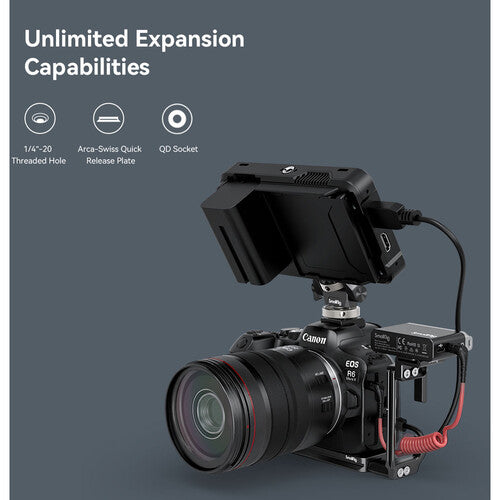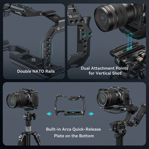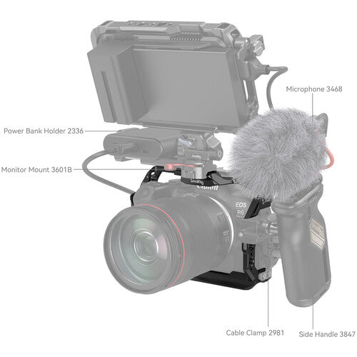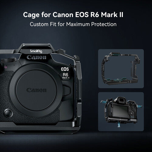 The lightweight aluminum Camera Cage from SmallRig provides accessory mounting and protection for your Canon EOS R6 Mark II camera. This formfitting cage maintains access to the camera's controls, battery, and SD card slot, and it features a variety of mounting options. The cage features an integrated Arca-type base for easy mounting onto a variety of compatible tripods.