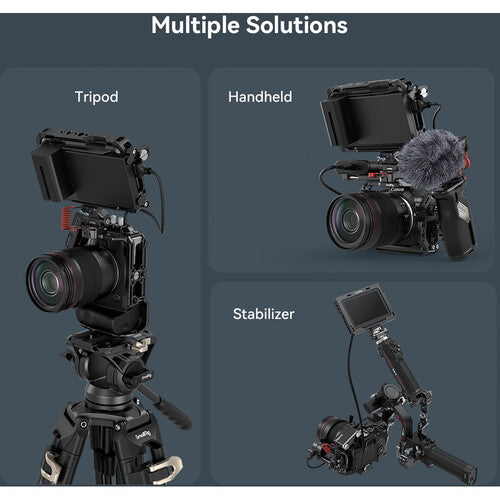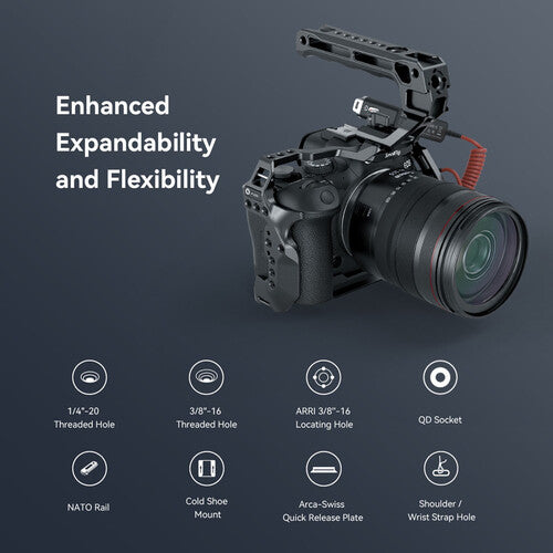 The camera mounts onto the cage using a single 1/4"-20 screw, and there are side locks on each side and a silicone pad on the base to prevent the camera from twisting or scratching. In addition to multiple 1/4"-20 and 3/8"-16 accessory threads, the cage features several ARRI-style locating holes to prevent accessories from twisting when mounted on the cage.