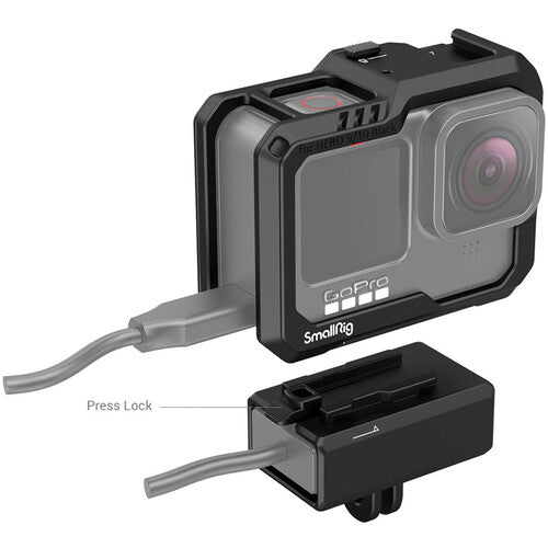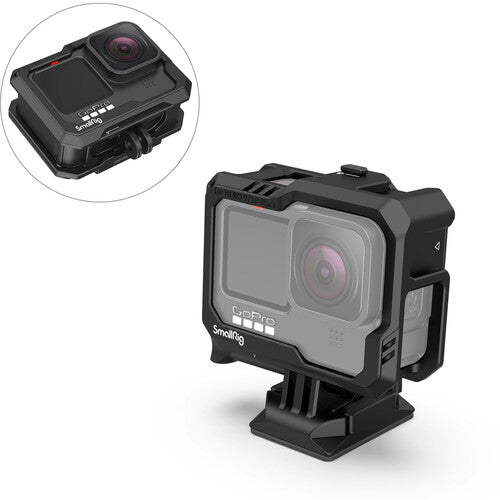 This Camera Cage from SmallRig protects your GoPro HERO12, HERO11, HERO10, or HERO9 Black camera and provides multiple accessory mounts plus a detachable mount for the audio/mic adapter on the bottom. This durable cage can be easily mounted with a press of the locking cover, no tools required. Mount the cage using GoPro's own two-prong folding-fingers mount or with the two-prong mount on the bottom of the included base mount adapter.