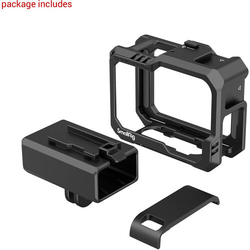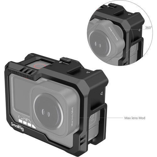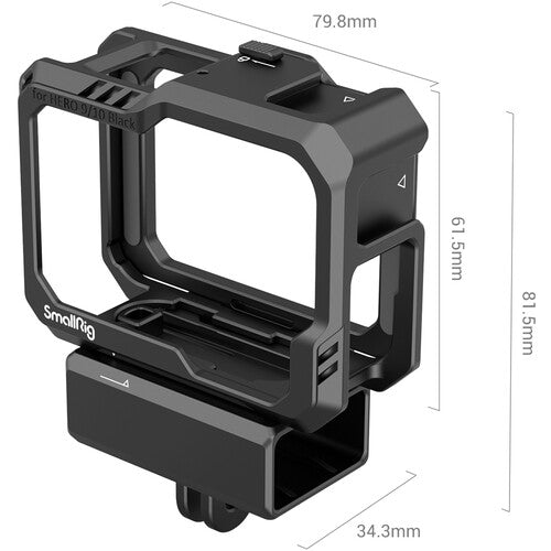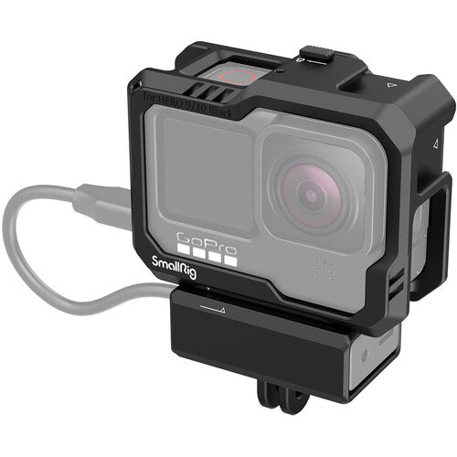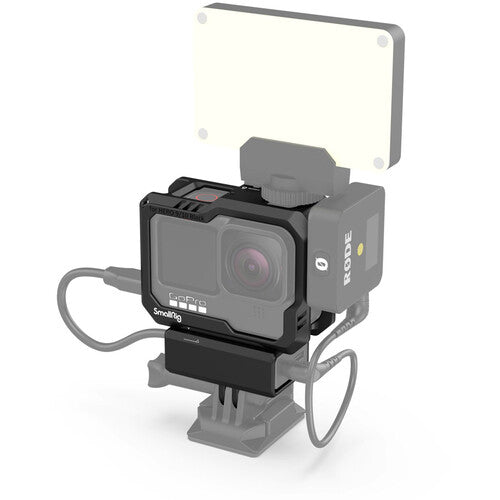 This Camera Cage from SmallRig protects your GoPro HERO12, HERO11, HERO10, or HERO9 Black camera and provides multiple accessory mounts plus a detachable mount for the audio/mic adapter on the bottom. This durable cage can be easily mounted with a press of the locking cover, no tools required. Mount the cage using GoPro's own two-prong folding-fingers mount or with the two-prong mount on the bottom of the included base mount adapter.