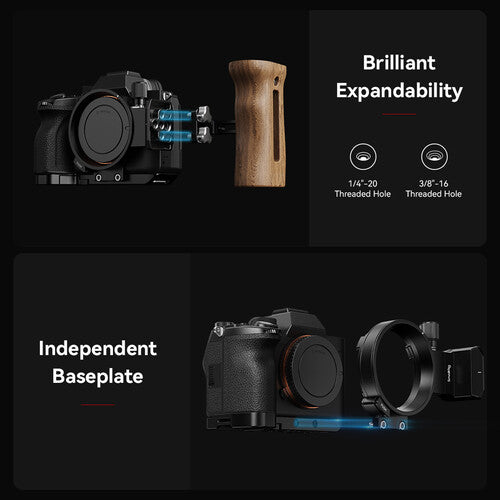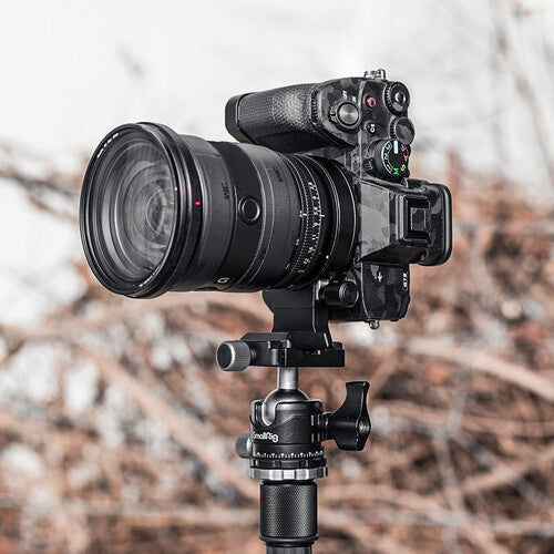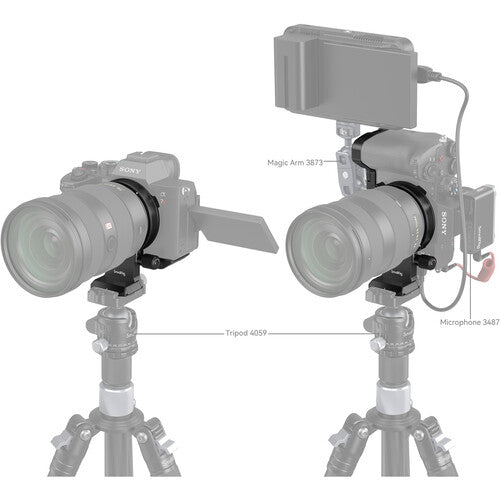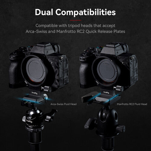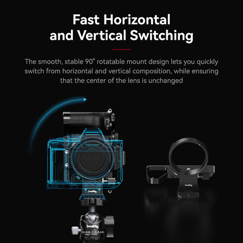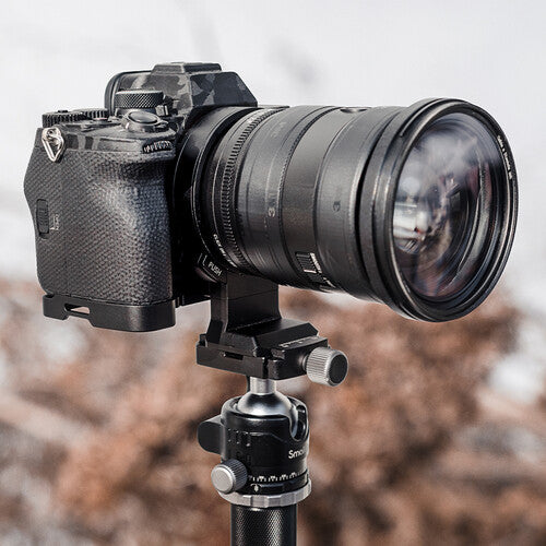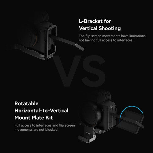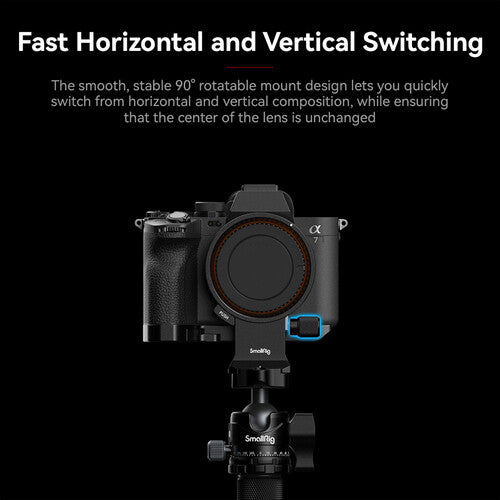 This Rotatable Horizontal-to-Vertical Mount Plate Kit for Sony Mirrorless Cameras from Smallrig is a faster and more versatile alternative to using a conventional L-bracket to mount select Sony mirrorless cameras to a tripod head. This lightweight rotating mechanism allows camera orientation to be changed with the flick of a wrist, then locked in place with a large, ergonomic knob. The plate mounts to the base of the camera, leaving the sides and back uncover for full access to the ports and LCD screen. The base plate also allows full access to the camera's battery door. The lens release button makes it easy to change lenses without having to remove the camera from the mount or the tripod. The versatile mounting foot is compatible with both Arca-type and Manfrotto RC2 quick release systems.