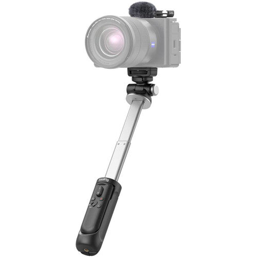 The SR-RG1 Wireless Shooting Grip from SmallRig is a versatile shooting grip, selfie stick, and tabletop tripod combo for select Sony and Canon cameras. This grip improves shooting stability and is ideal for vlogging, livestreaming, and everyday use. It features a detachable Bluetooth wireless remote control with a wireless remote status indicator, a battery level indicator, and a USB-C charging port. The integrated head tilts 180° and rotates 360° for easier positioning, and the base of the grip has a 1/4"-20 threaded mounting socket.