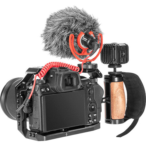This comfortable aluminum and wood grip attaches to your cage via two 1/4"-20 thumbscrews spaced 0.7" apart, and it slides to adjust vertically for the right position. There is a shoe mount on top for adding a light, microphone, monitor, mounting arm, or other accessory. An integrated strap slot allows you to add a hand or wrist strap for additional safety and support. An Allen wrench stores inside the handle for adjusting the vertical position.