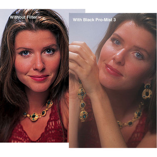 The 82mm Tiffen Black Pro-Mist 1/4 Filter helps to reduce the value of the highlights while slightly lowering the overall contrast. This filter is especially useful for smoothing out and softening facial wrinkles and other blemishes. While designed for use with movies, this filter can also be used for fashion and beauty applications. Unlike a traditional diffusion or soft focus filter, Pro-Mist filters provide little loss of detail across the image. The 1/4 density provides more contrast and highlight reduction than the 1/8, but less than the 1/2, while still allowing for a soft, pastel-like quality of light.