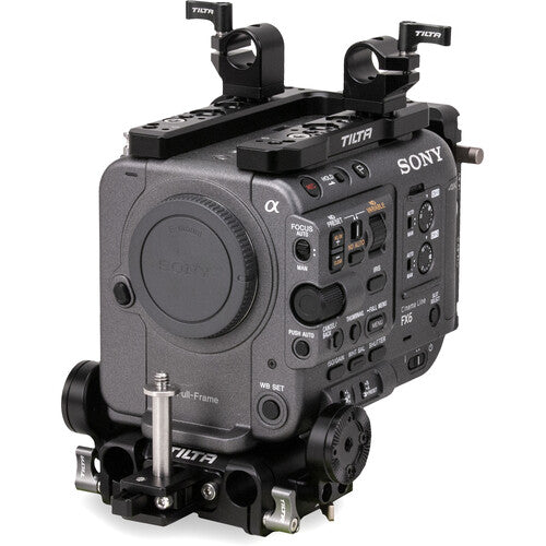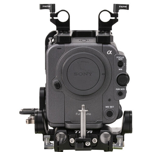 The baseplate features ARRI-compatible rosettes on each side for attaching optional handheld accessories, and it integrates 15mm LWS rod clamps and a built-in lens support. The baseplate is compatible with ARRI and Tilta dovetail plates for mounting and balancing your camera on tripods and other support platforms. The top plate attaches directly to your camera and provides a space that accommodates Sony's top handle for the FX6, as well as a Tilta top handle for the FX6 (not included).