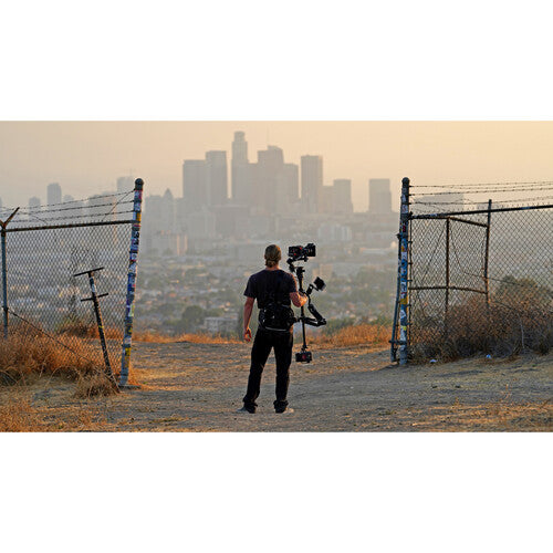 The Float system supports an RS 2 gimbal rig up to 22 lb, and it mounts onto the extension post. The post can extend from 19.6 to 39.4" for just the right height for your shot, and it mounts onto the stabilizer arm. The stabilizer arm supports approximately 31.5" of up and down movement to keep the stabilizer even steadier. The stabilizer arm mounts on the adjustable vest that fits waists from 23.6 to 47.2" around to create comfortable support and take the load off your back and arms.