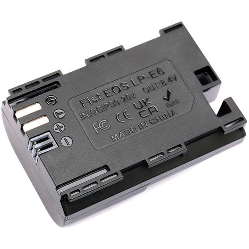 The cable regulates its voltage from 9-20V to match the voltage of a typical LP-E6 battery. The 19.7" USB-C cable plugs into a separately available PD/QC fast charging power adapter, and it also supports Samsung AFC and Huawei FCP protocols.